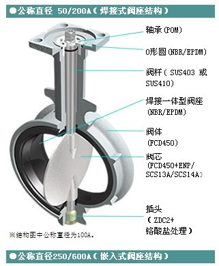●小尺寸产品(50/200A)采用了焊接式阀座结构设计,使阀体与橡胶阀座合为一体,因此即使是标准型产品也能在高流速或真空管环境下使用。[250A 以上尺寸的产品可通过选购配置(橡胶阀座与阀体粘在一起),实现与焊接式结构产品相同的性能。]