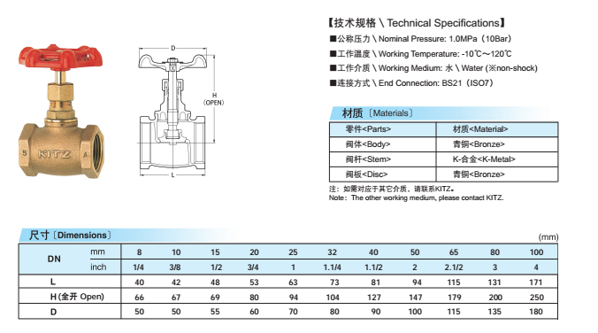 日本KITZ A形青铜截止阀用于工业和工厂医院管道水系统, 产品型号;A截止阀 阀体材质;青铜 适用介质;水、油、气 压力 ;PN16 口径 ;DN8-DN100 阀杆;合金 填料;强化聚四氟乙烯 手轮 ;锌压铸DN8-DN25 / 铝压铸DN32-DN80 / 灰铸铁DN100 尺寸结构图; A 截止阀图片;